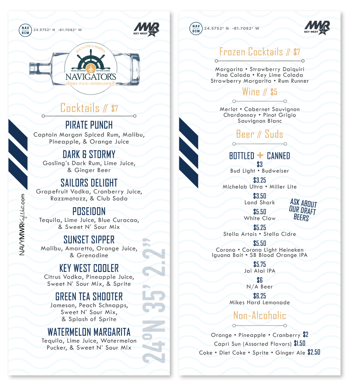Navigator’s Bar is a full-service bar located at the Boca Chica Marina along with Fly Away Cafe. There is indoor and outdoor seating as well as tiki huts on the beach located directly outside the restaurant and bar. The tiki huts are available to rent along with kayaks and paddleboards. For more information or to arrange a party, please reach out via email.